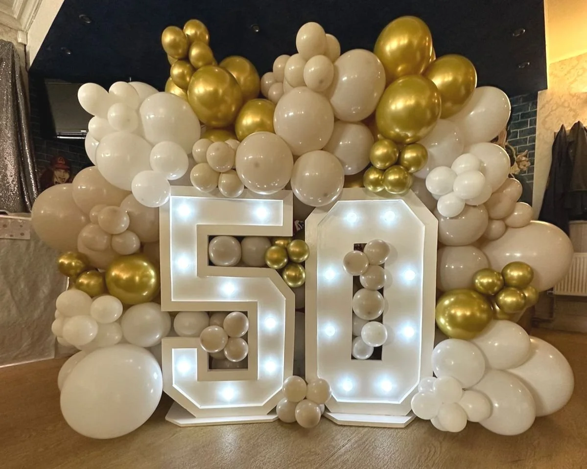 Large Balloon arch (surrounding numbers) OR additional hoop with half balloons added.